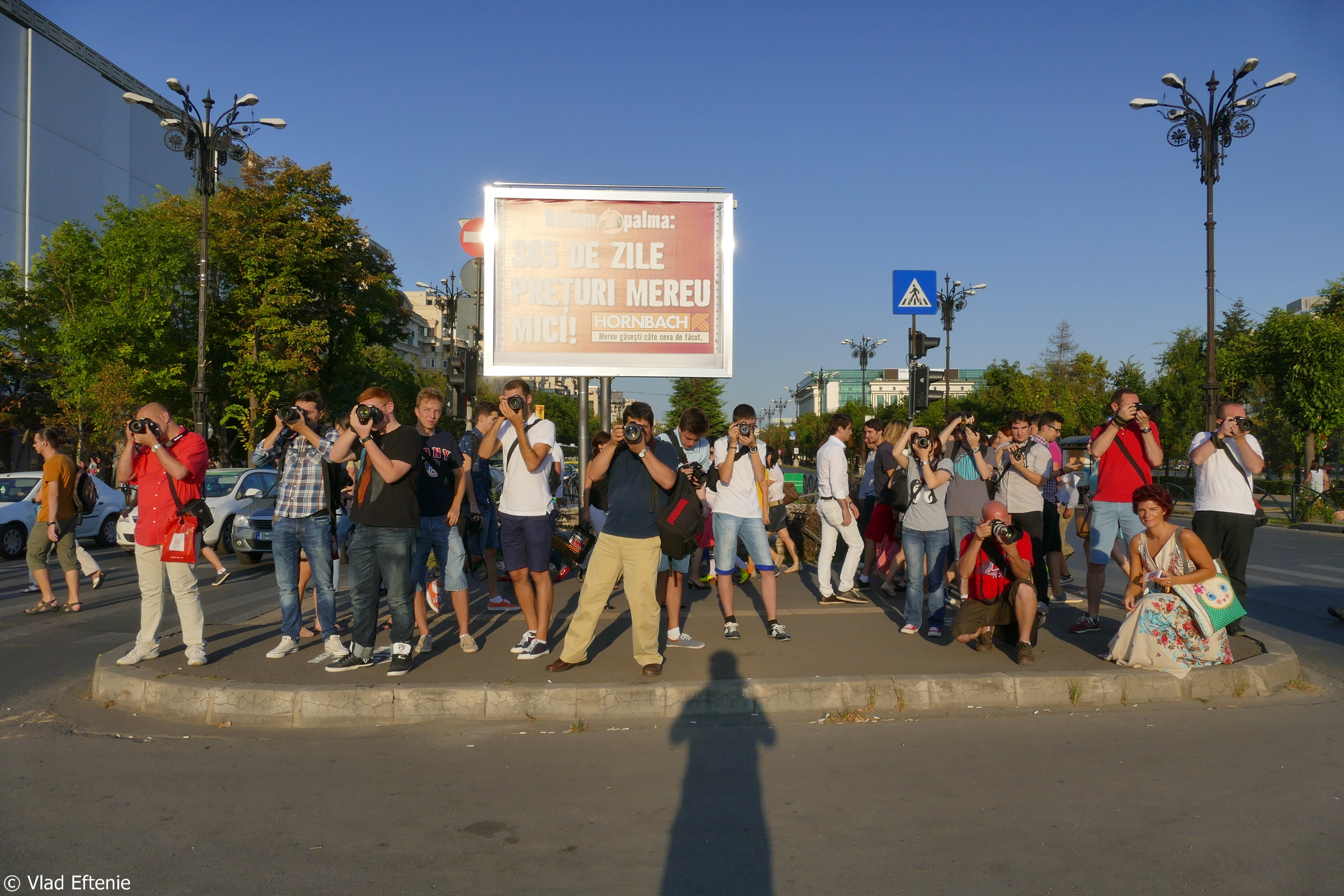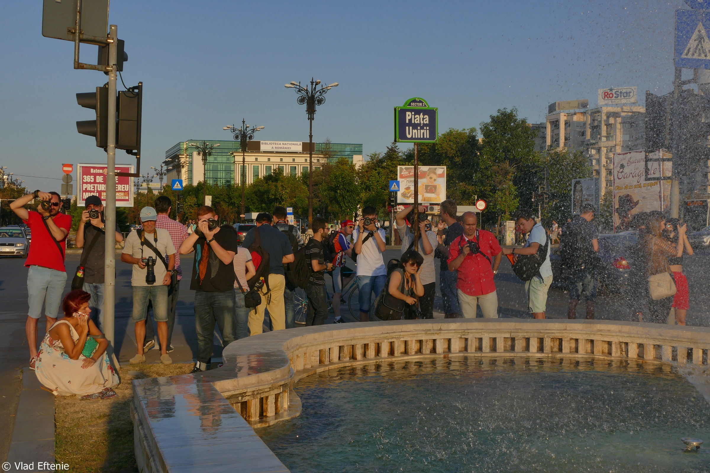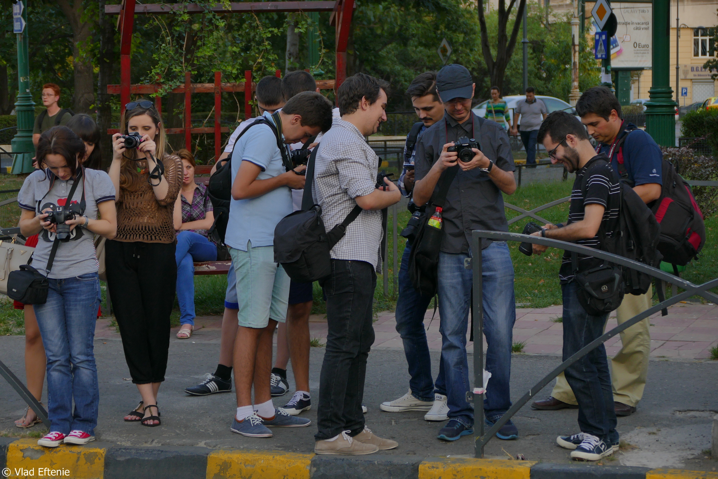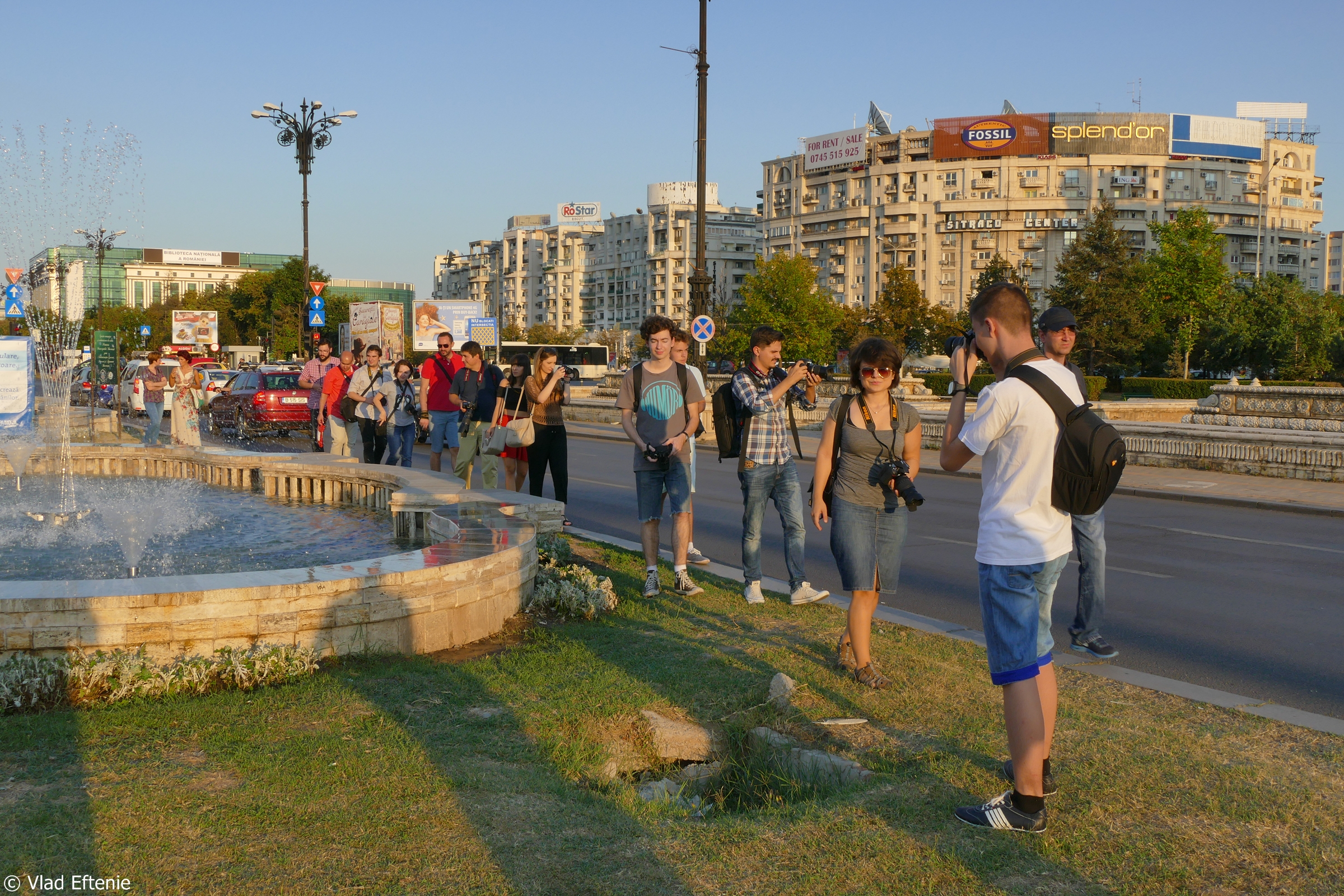 Vlad Eftenie Am sărbătorit ziua fotografiei prin muncă 🙂 întrucât am în teste un aparat care urmează a fi lansat, am făcut câteva sute de cadre deja, până la ora întâlnirii, de “încălzire”. Pentru că am ales ca loc de desfăşurare a turei foto zona Pieţei Unirii, încă de dimineaţa mi-am făcut temele şi am inspectat locul. Am reuşit chiar să ajung într-un punct înalt de observaţie şi să pot cuprinde cu privirea întreg ansamblul. Am ales Piaţa Unirii din mai multe motive. Este un loc cu valenţe fotografice multiple – loc al aglomerării, zona de importanţă centrală. Axul bulevardului Unirii- marcat de silueta Casei Poporului, propune jocul fântânilor. Staţia tramvaiului 32 este un loc aglomerat si te poti strecura printre oamenii aflaţi în mişcare. Parcul central presupune chiar abordarea peisajului urban de tip skyline. Zona din faţa McDonalds este locul probabil cel mai folosit – reper, pentru întâlniri. Celelalte două fronturi cu magazine sunt şi ele foarte aglomerate, locuri numai bune pentru a fotografia oameni. Îmi place să organizez grupuri de lucru pentru a exersa fotografia street, o fac de câţiva ani cu ocazia workshopurilor pe care le susţin, mai mereu aducând un element experimental. Fotografia de stradă se face în mod normal solitar, pentru ca fotograful să poate fi discret. În grup, e mai dificil. Am întâmpinat această aparenţă constrângere mizând pe comunicare, pe impărtaşirea ideilor, sfaturilor, părerilor, indicaţiilor, răspunzând la orice întrebare – mizând pe încurajarea gestului fotografic autentic ce poate fi apoi exersat desigur solitar. Am reuşit să parcurgem zona din faţa magazinului Unirea, trecând pe la fântâni, prin staţia tramvaiului 32, pe latura vestică a frontului construit – cu maxima aglomeraţie la ora respectivă, ieşind în parc – în două ore şi jumătate. Grupul a interactionat pozitiv cu oamenii cu care am stabilit un contact verbal, atmosfera de voie bună a fost la ea acasă. Am demontat mitul conform căruia fotografiatul pe stradă e periculos şi cere măsuri speciale de camuflare sau de comunicare. Totul a decurs normal, culminând cu un shooting propus unor tineri, în parc, care işi făceau poze. Le-a spus că au ocazia de a fi pozaţi de câţiva zeci de fotografi talentaţi şi au acceptat jocul imediat.