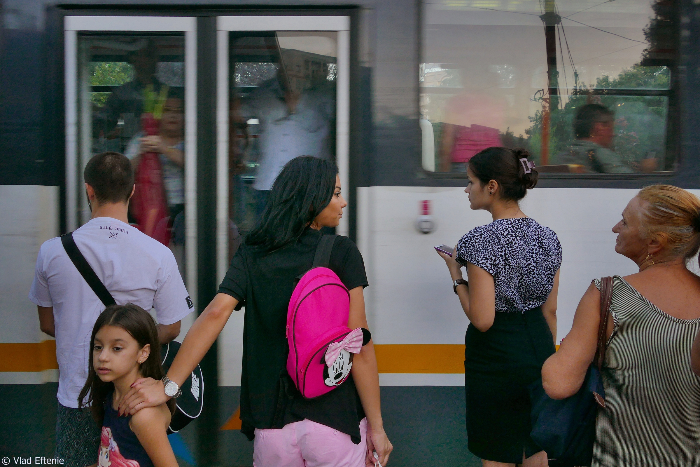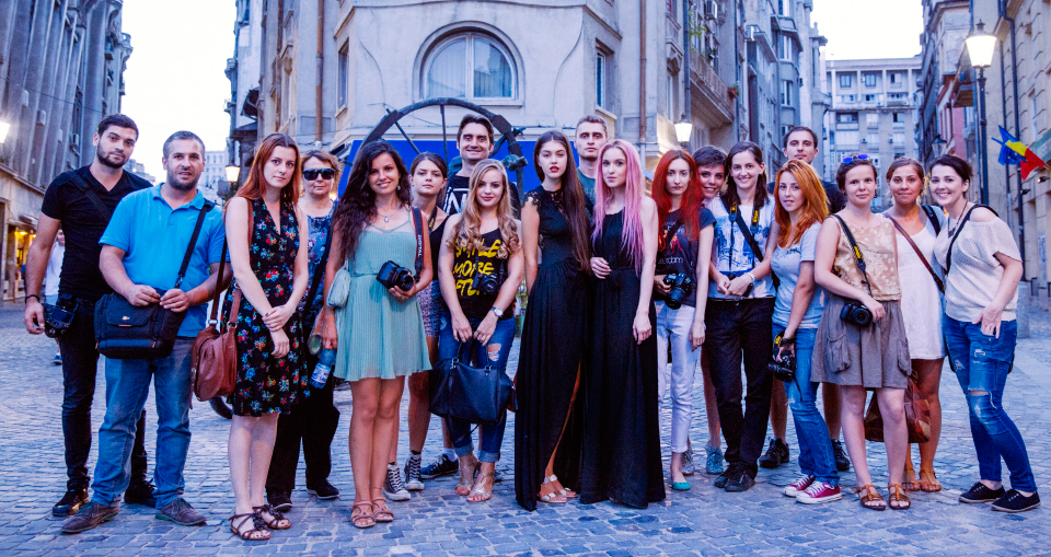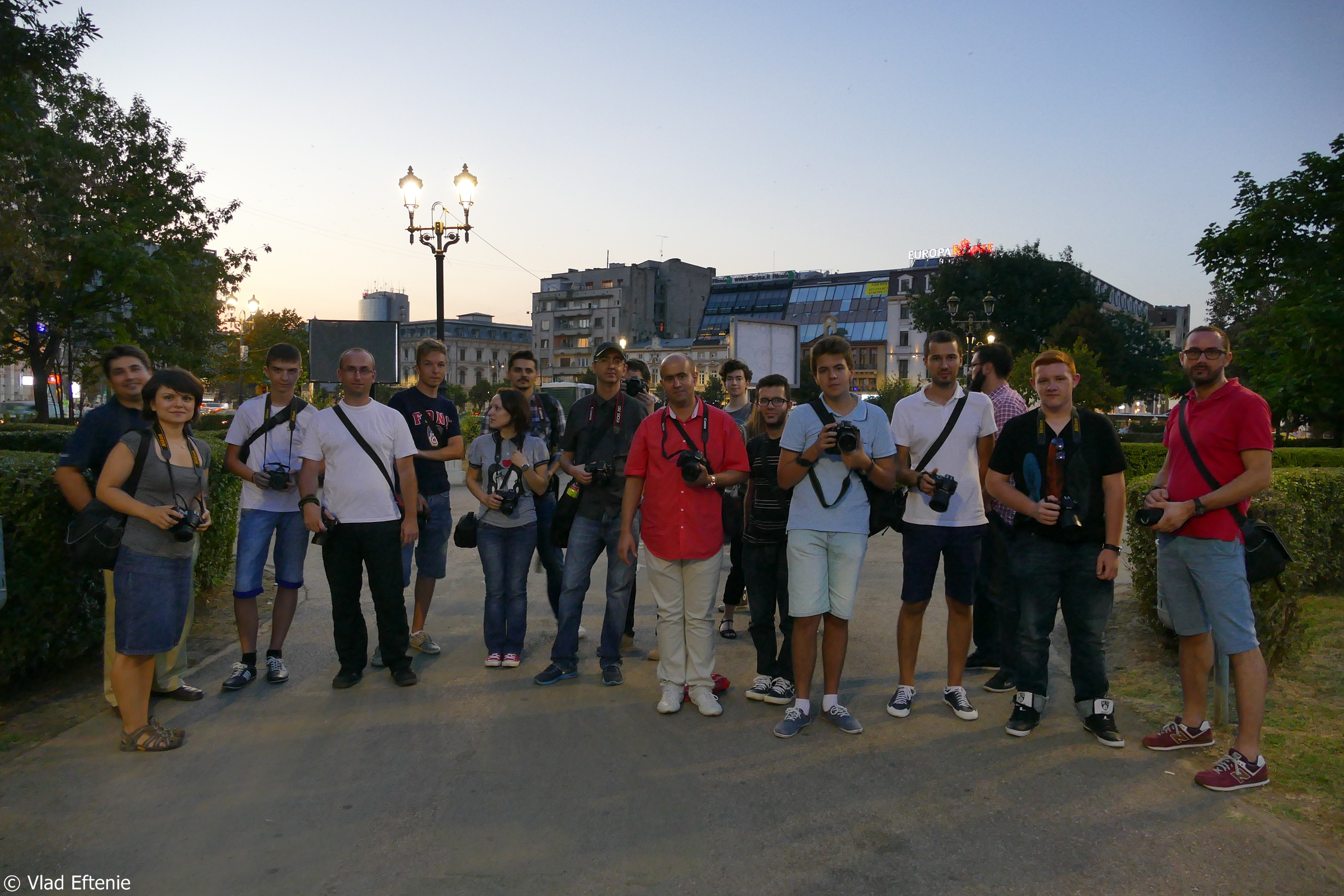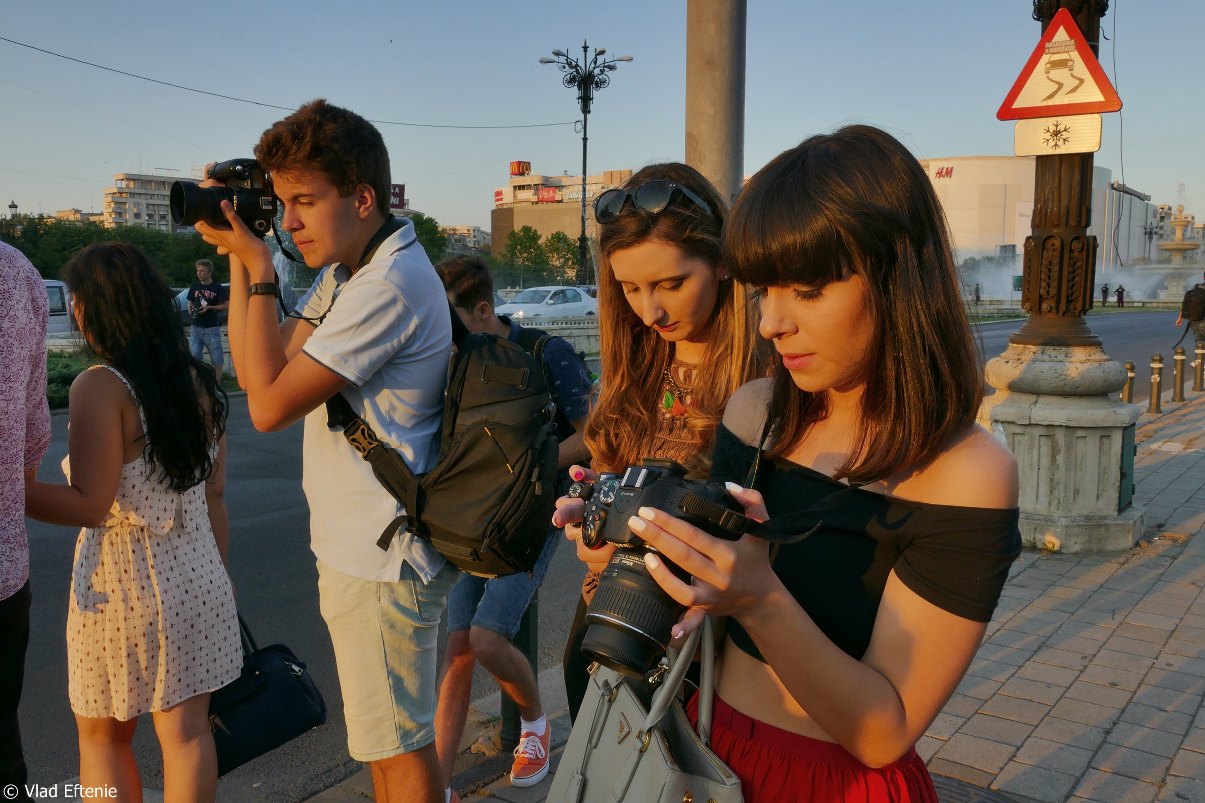 Vlad Eftenie Am sărbătorit ziua fotografiei prin muncă 🙂 întrucât am în teste un aparat care urmează a fi lansat, am făcut câteva sute de cadre deja, până la ora întâlnirii, de “încălzire”. Pentru că am ales ca loc de desfăşurare a turei foto zona Pieţei Unirii, încă de dimineaţa mi-am făcut temele şi am inspectat locul. Am reuşit chiar să ajung într-un punct înalt de observaţie şi să pot cuprinde cu privirea întreg ansamblul. Am ales Piaţa Unirii din mai multe motive. Este un loc cu valenţe fotografice multiple – loc al aglomerării, zona de importanţă centrală. Axul bulevardului Unirii- marcat de silueta Casei Poporului, propune jocul fântânilor. Staţia tramvaiului 32 este un loc aglomerat si te poti strecura printre oamenii aflaţi în mişcare. Parcul central presupune chiar abordarea peisajului urban de tip skyline. Zona din faţa McDonalds este locul probabil cel mai folosit – reper, pentru întâlniri. Celelalte două fronturi cu magazine sunt şi ele foarte aglomerate, locuri numai bune pentru a fotografia oameni. Îmi place să organizez grupuri de lucru pentru a exersa fotografia street, o fac de câţiva ani cu ocazia workshopurilor pe care le susţin, mai mereu aducând un element experimental. Fotografia de stradă se face în mod normal solitar, pentru ca fotograful să poate fi discret. În grup, e mai dificil. Am întâmpinat această aparenţă constrângere mizând pe comunicare, pe impărtaşirea ideilor, sfaturilor, părerilor, indicaţiilor, răspunzând la orice întrebare – mizând pe încurajarea gestului fotografic autentic ce poate fi apoi exersat desigur solitar. Am reuşit să parcurgem zona din faţa magazinului Unirea, trecând pe la fântâni, prin staţia tramvaiului 32, pe latura vestică a frontului construit – cu maxima aglomeraţie la ora respectivă, ieşind în parc – în două ore şi jumătate. Grupul a interactionat pozitiv cu oamenii cu care am stabilit un contact verbal, atmosfera de voie bună a fost la ea acasă. Am demontat mitul conform căruia fotografiatul pe stradă e periculos şi cere măsuri speciale de camuflare sau de comunicare. Totul a decurs normal, culminând cu un shooting propus unor tineri, în parc, care işi făceau poze. Le-a spus că au ocazia de a fi pozaţi de câţiva zeci de fotografi talentaţi şi au acceptat jocul imediat.