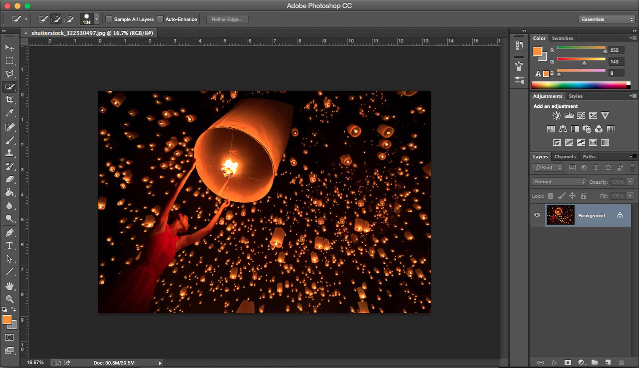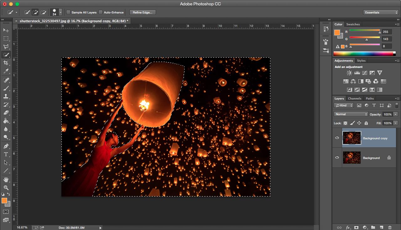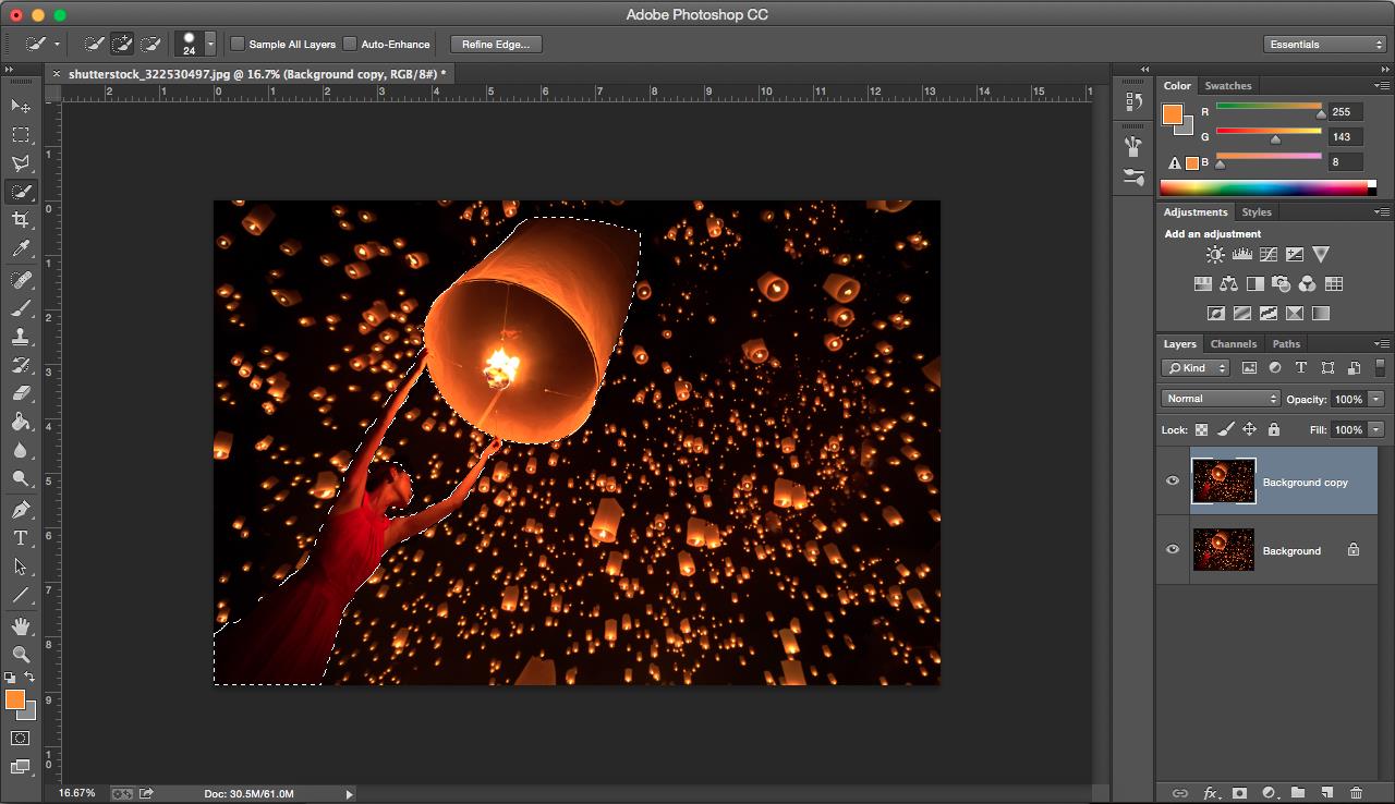 In imaginile din articol, fata care tine lampionul este subiectul principal, asadar ea va ramane focalizata. In layer-ul“Background Copy”, foloseste Quick Selection Tool (pe care o gasesti in bara de unelte) pentru a selecta si contura subiectul dorit de tine. Apasa click si plimba-te pe langa subiect, fii atent sa ascoperi totul cu grija si sa nu lasi spatii din fundal pe dinafara. Vei vrea sa selectezi doar subiectul ca sa eviti bucati care vor ramane in afara bokeh-ului si modificarilor pe care le vei face ulterior.