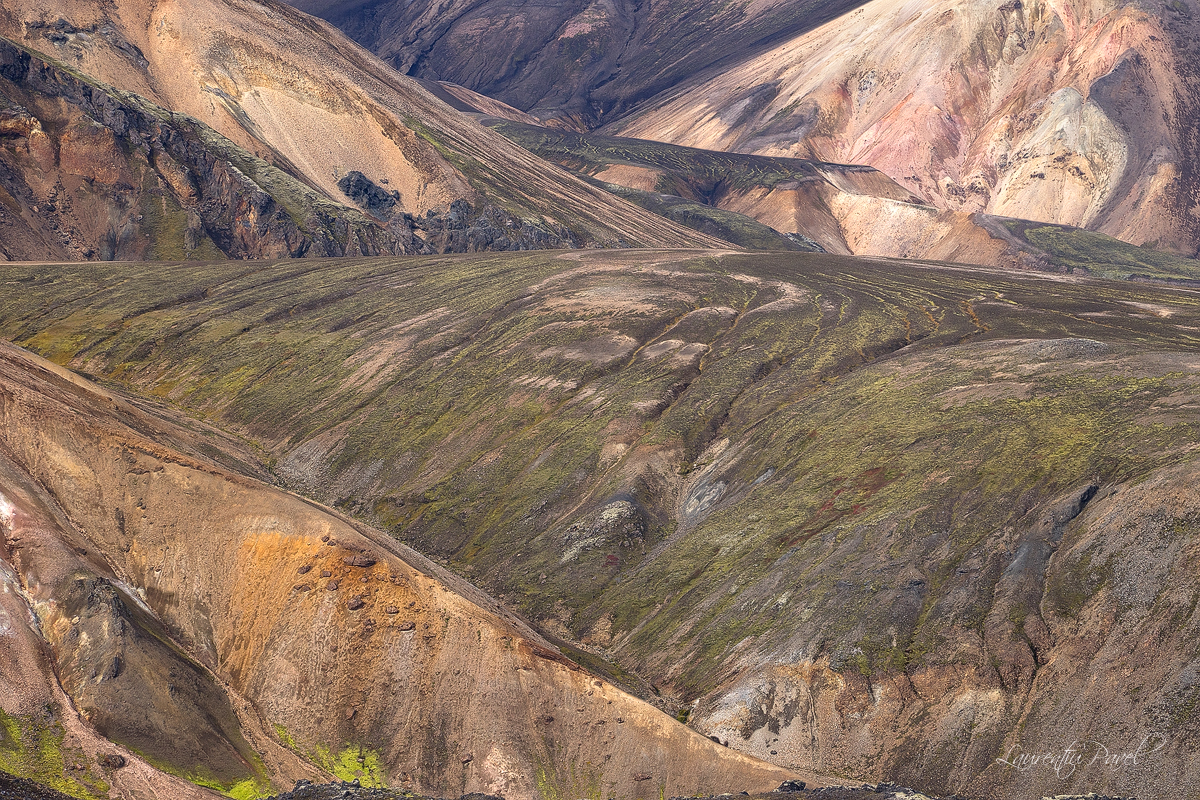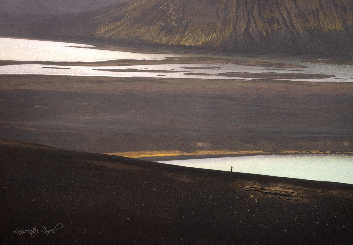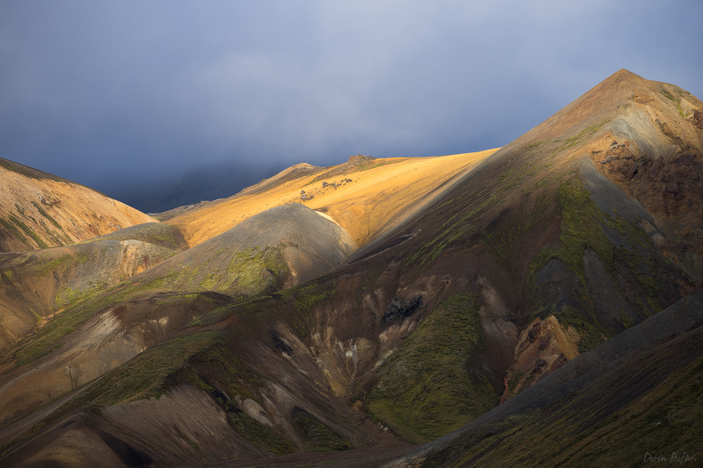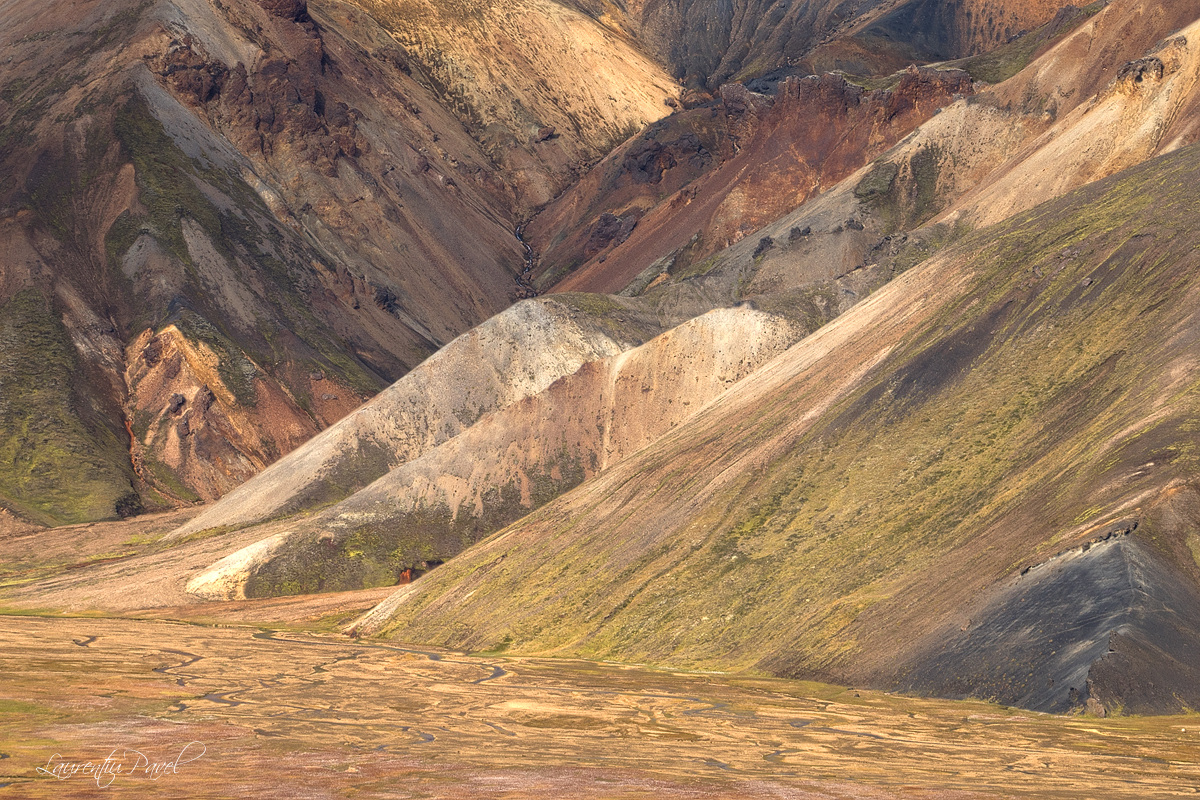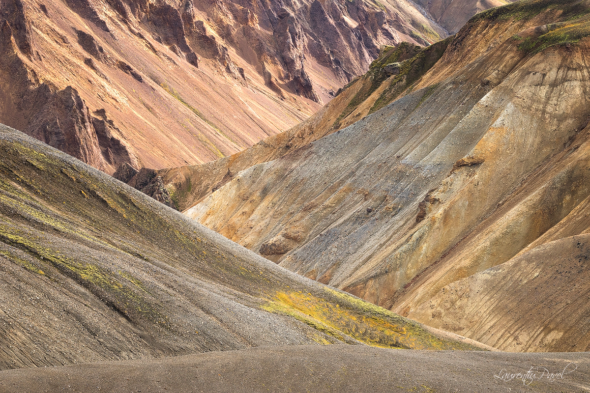 Planul inițial era să stăm cât mai mult în interiorul Islandei. Ultima mea vizită acolo a fost în 2014, când după 70 km parcurși în două zile pe bicicletă, pe teren accidentat și cu vreo 12 râuri trecute, am ajuns la Landmannalaugar, unul din locurile speciale de pe insulă. Asta avea deci să fie prima oprire. Am luat-o pentru siguranță pe partea mai ușoară, adică aia fără râuri și-am ajuns cu bine pe noapte. A doua zi, de dimineață, ne-am și pornit să explorăm fotografic zona. La un moment dat m-a sunat Aura să mă întrebe dacă lui Laurențiu i-a căzut mandibula după ce a văzut cum arată locul. Landmannalaugar, parte a rezervației naturale Fjallabak, e aparte pentru că e multicolor.