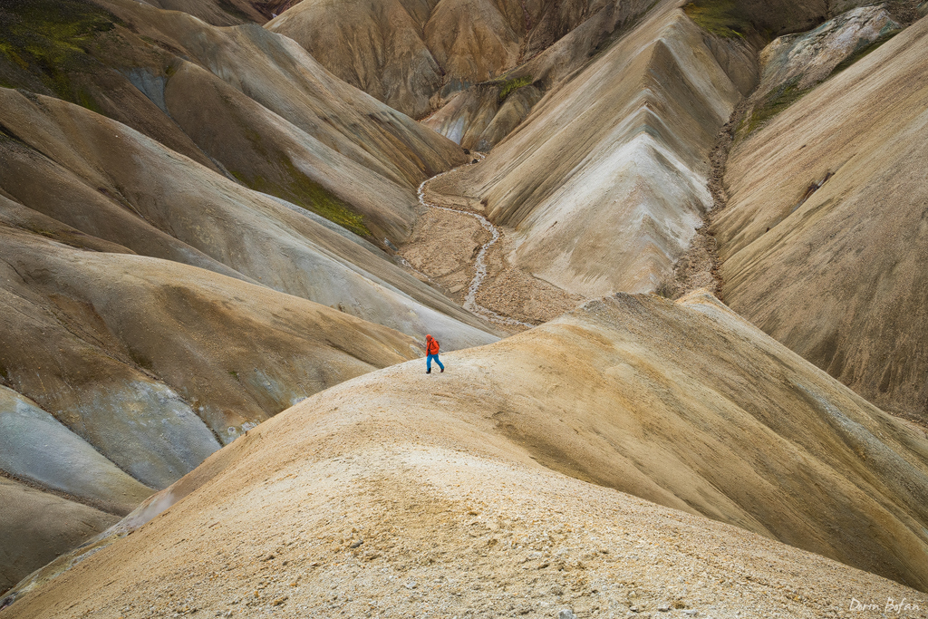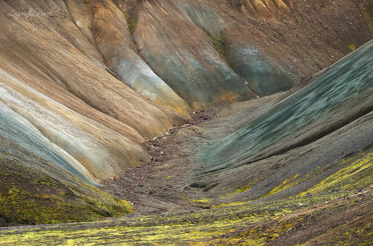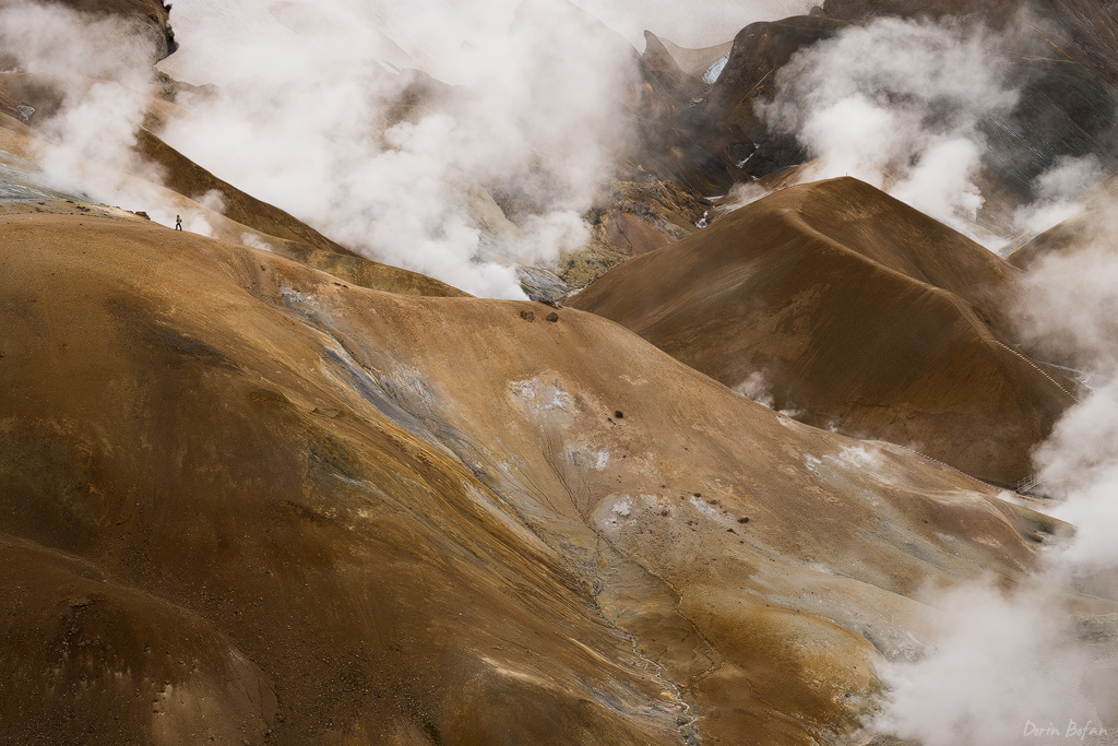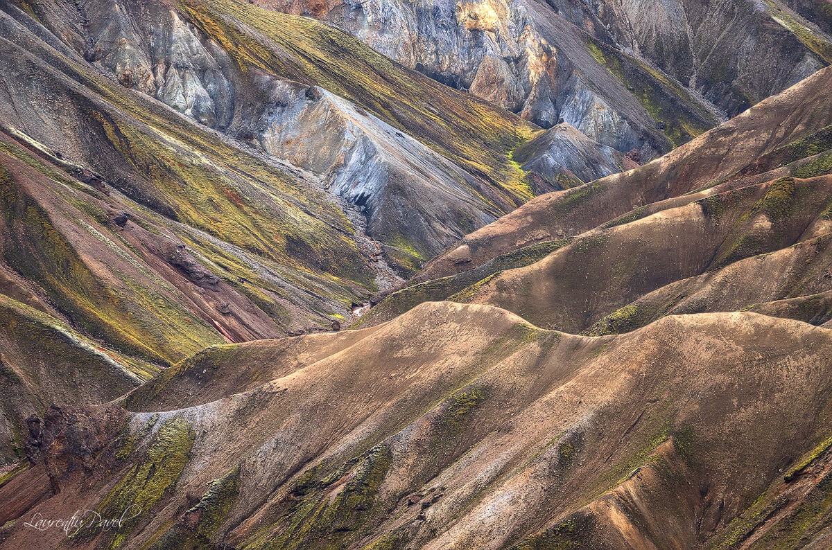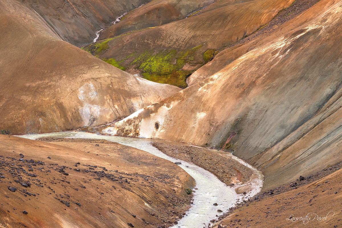Planul inițial era să stăm cât mai mult în interiorul Islandei. Ultima mea vizită acolo a fost în 2014, când după 70 km parcurși în două zile pe bicicletă, pe teren accidentat și cu vreo 12 râuri trecute, am ajuns la Landmannalaugar, unul din locurile speciale de pe insulă. Asta avea deci să fie prima oprire. Am luat-o pentru siguranță pe partea mai ușoară, adică aia fără râuri și-am ajuns cu bine pe noapte. A doua zi, de dimineață, ne-am și pornit să explorăm fotografic zona. La un moment dat m-a sunat Aura să mă întrebe dacă lui Laurențiu i-a căzut mandibula după ce a văzut cum arată locul. Landmannalaugar, parte a rezervației naturale Fjallabak, e aparte pentru că e multicolor.
