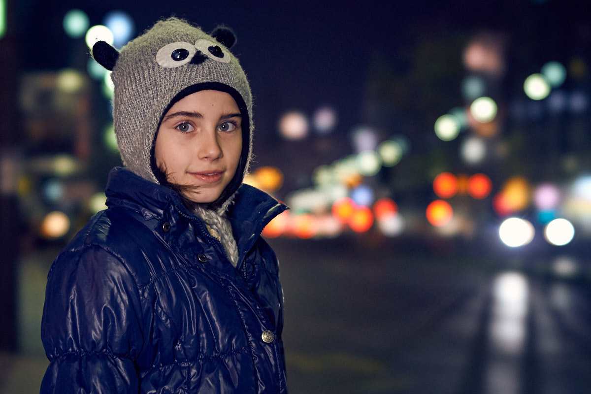 Plasează subiectul în apropierea unui stâlp de iluminat stradal (nu exact sub el, pentru că vei avea umbre urâte în jurul ochilor) sau lângă o vitrină mare și frumos iluminată, avand în același timp un fundal aglomerat, cu surse multiple de lumină. Cu cât acesta este mai aglomerat, cu atât efectul de bokeh din imaginea finală va fi mai spectaculos. Luminile diferite folosite de magazine în vitrine oferă iluminări diverse pentru subiect. Neoanele, becurile sau luminile stradale au temperaturi de culoare diferite, astfel că dacă te joci modificând balansul de alb poți obține cadre interesante. Acesta este motivul principal pentru care fotografiez RAW.