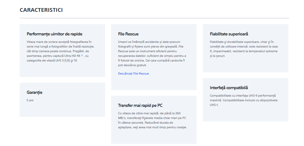 Acum însă, să revenim la cardul nostru, subiectul articolului. Sony DHC 32Gb Class10 260MB/s vine într-o cutie măricică pentru un obiect atât de mic, cu un design plăcut, curat. În interior se află instrucțiunile, garanția pe 5 ani și cardul, plus suportul pentru acesta. Pe spatele cutiei scrie mic în colțul dreapta sus unde trebuie să intri pentru a descărca aplicația de recuperare a datelor.
