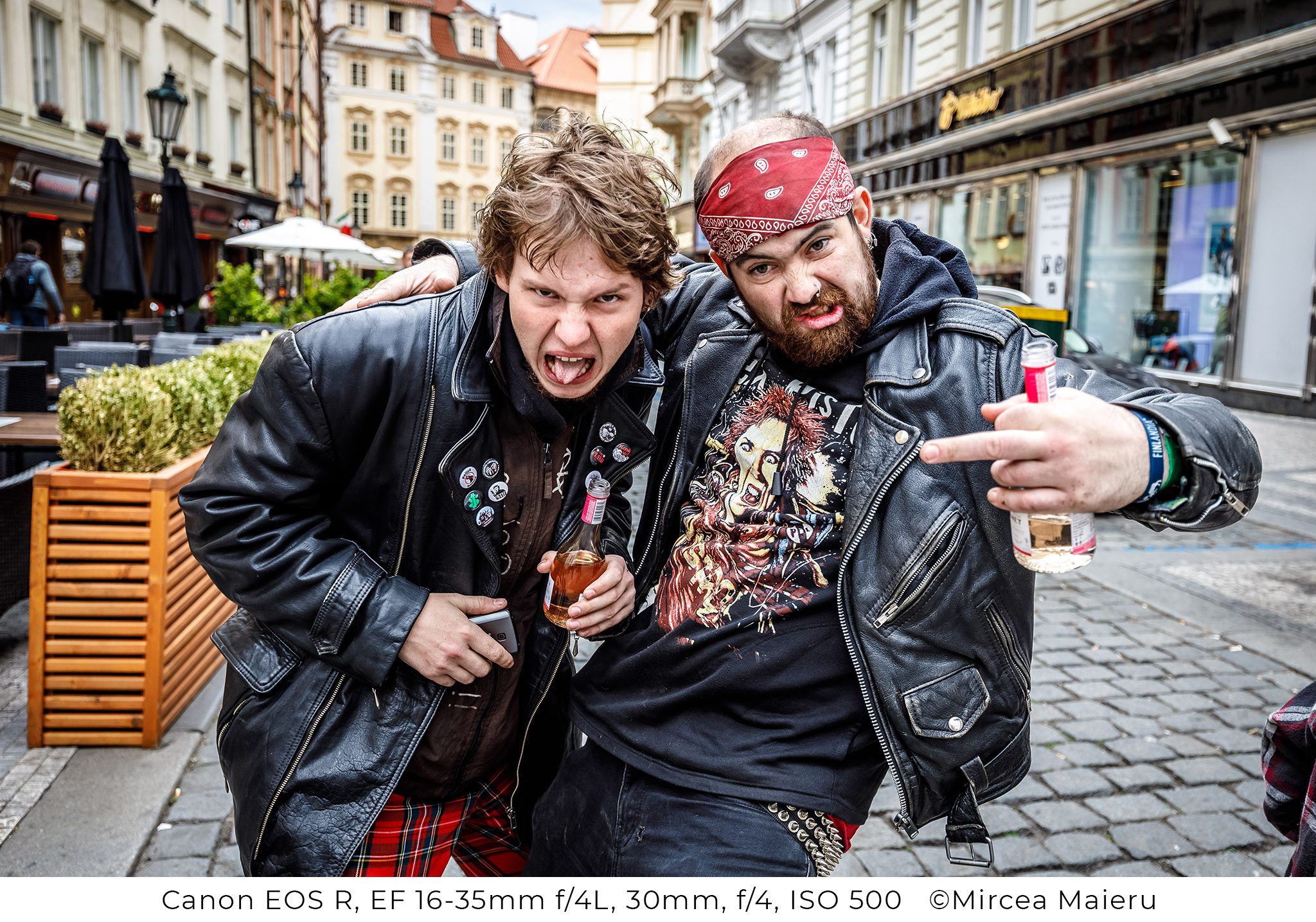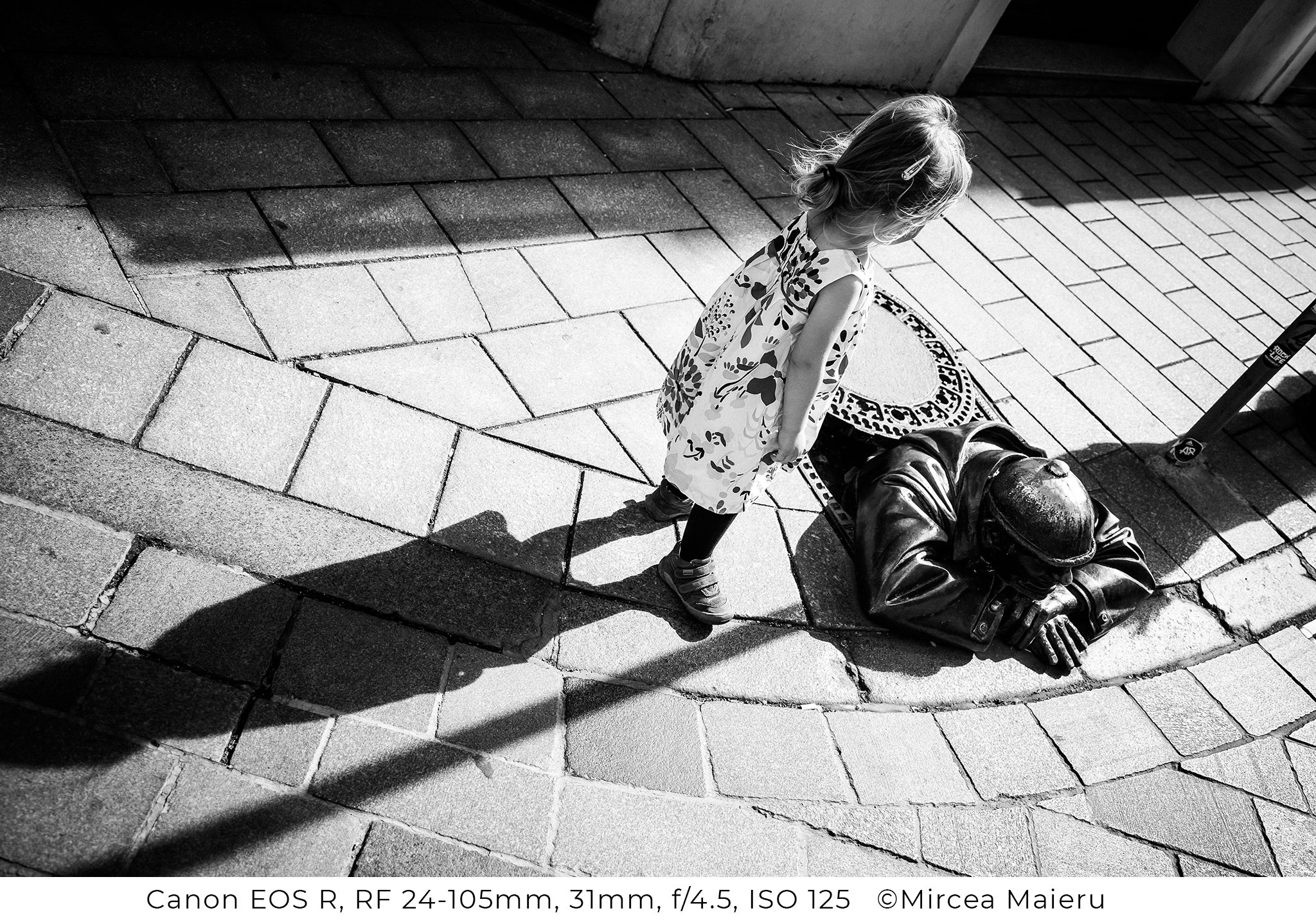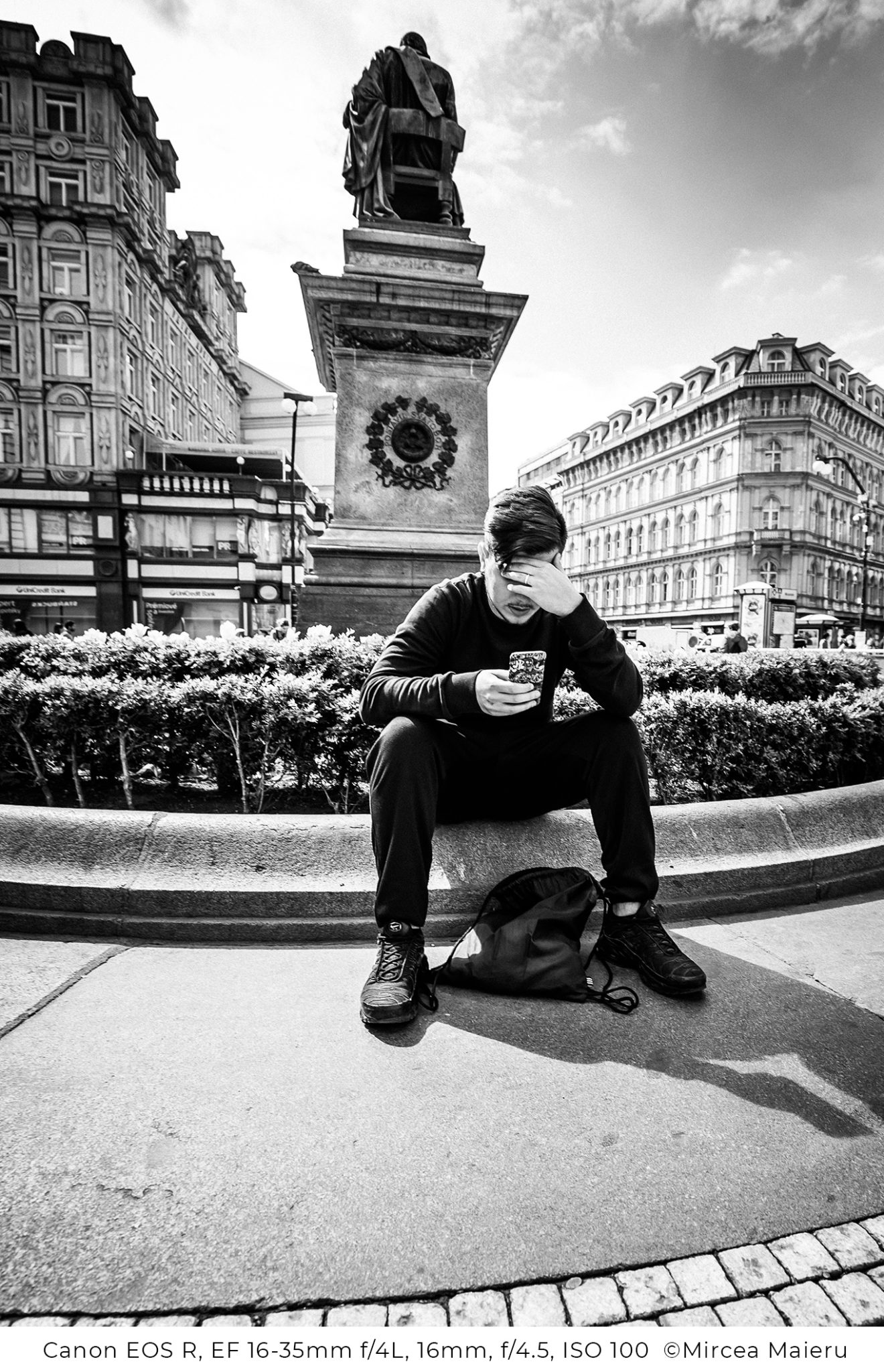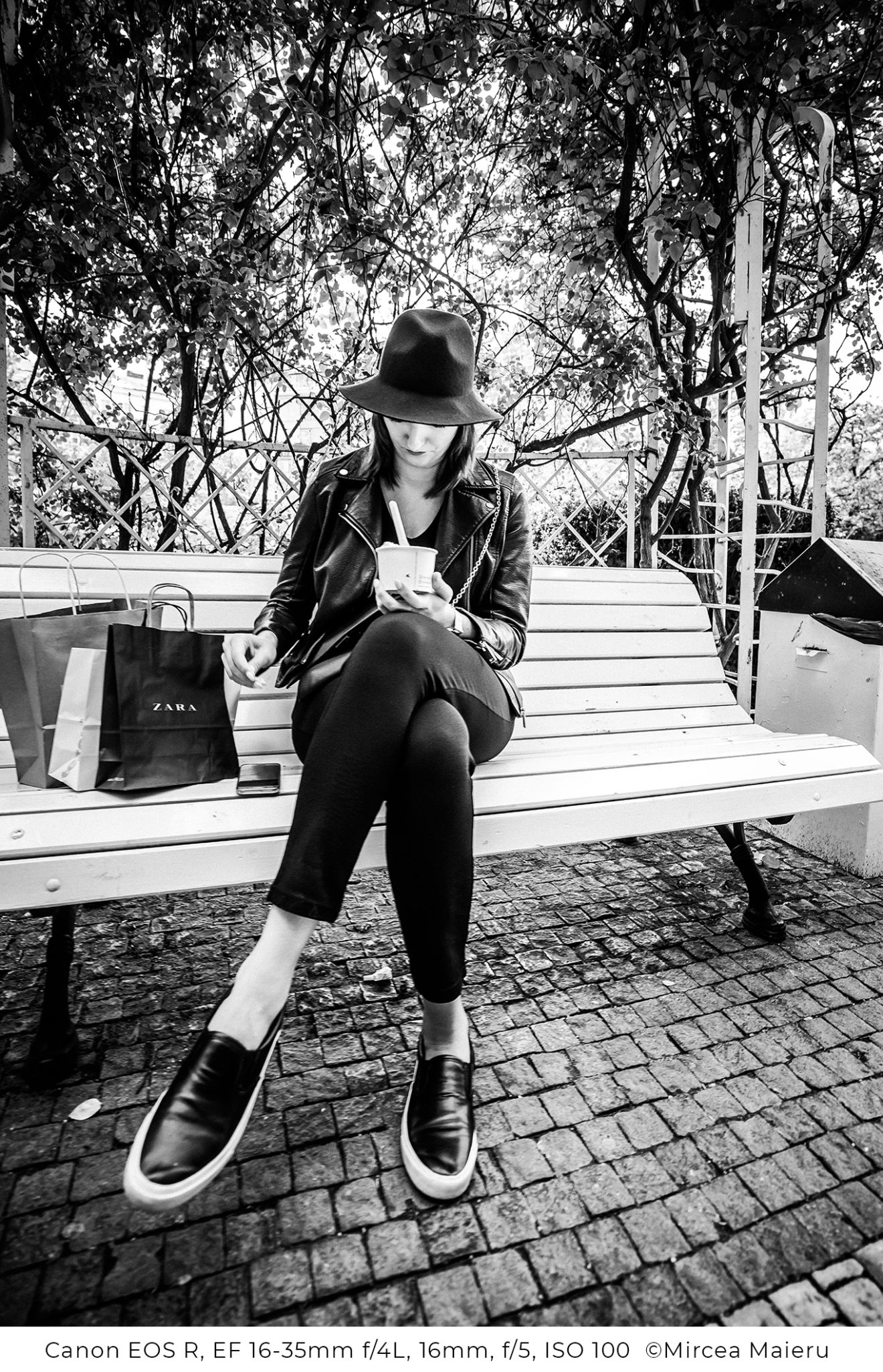 O altă abordare tehnică a fotografiei de stradă, cu aceeași focală ultra wide (grandangulară), este portretul de foarte aproape, cu punct de stație foarte jos, practic tot de la șold, iar avantajul major al lui EOS R aici este dat de posibilitatea de declanșare fără absolut nici un sunet, cu obturator electronic, putând astfel să “vânăm” cadrul și eventual să repetăm cadrul fără ca subiectul să iasă din starea de spirit inițială: