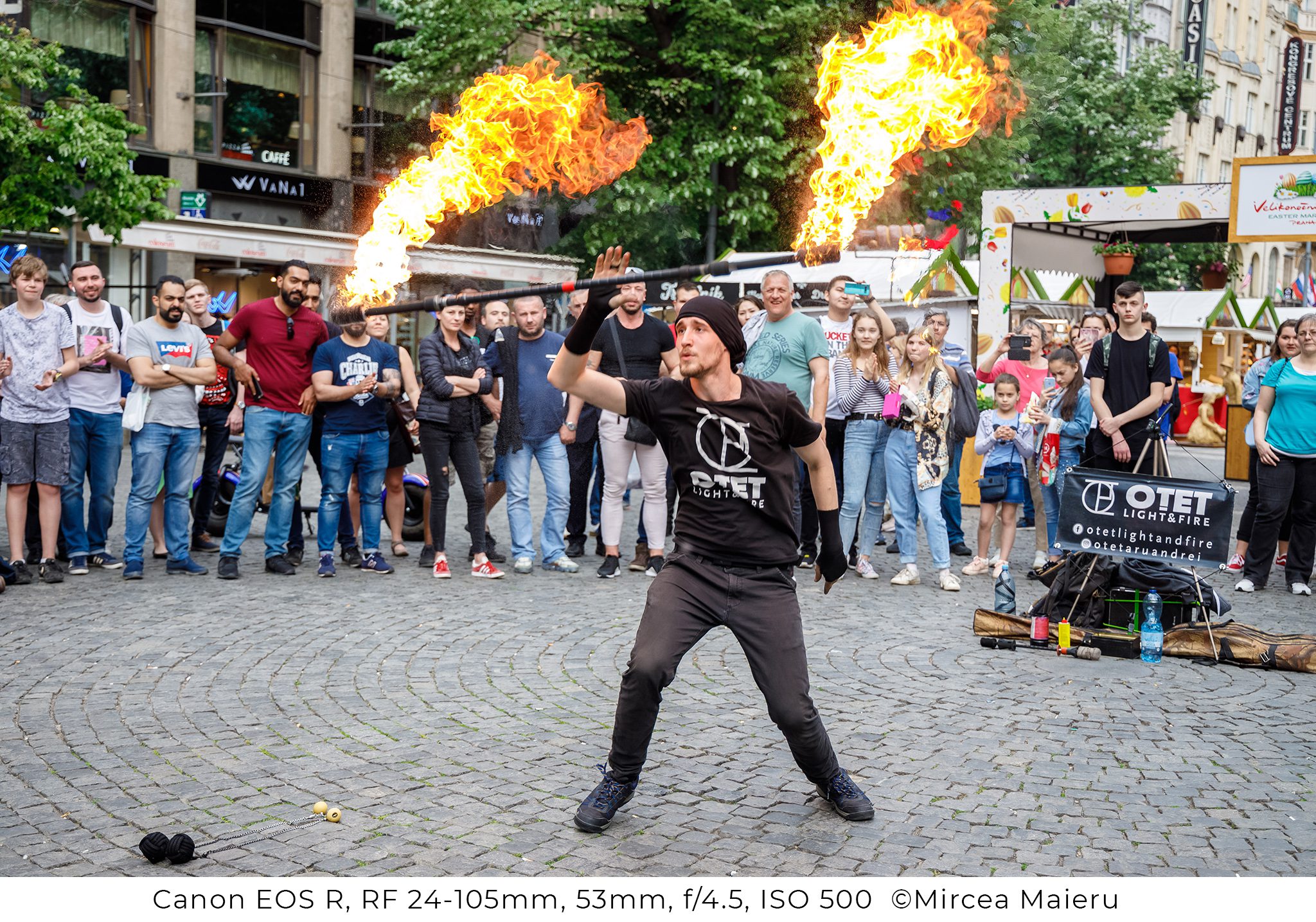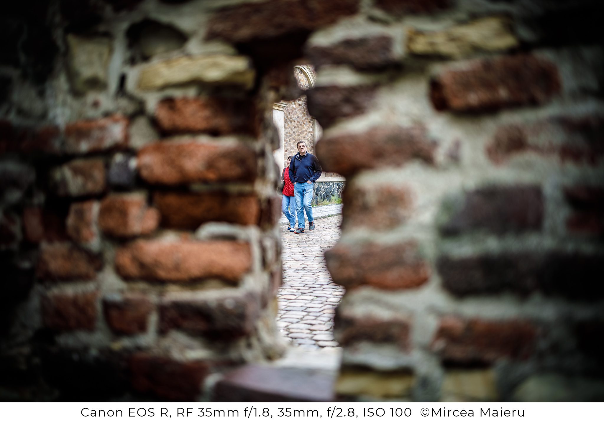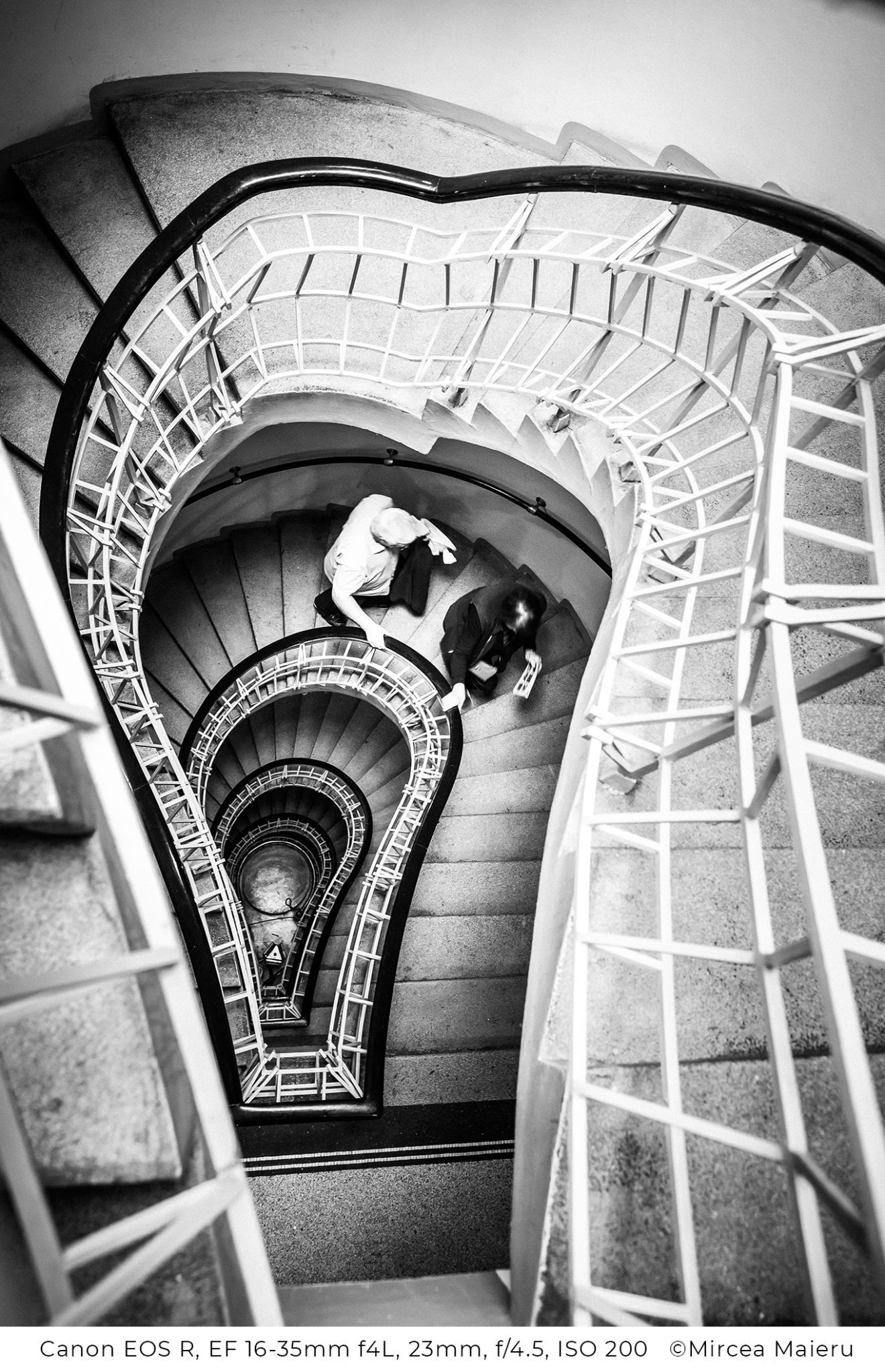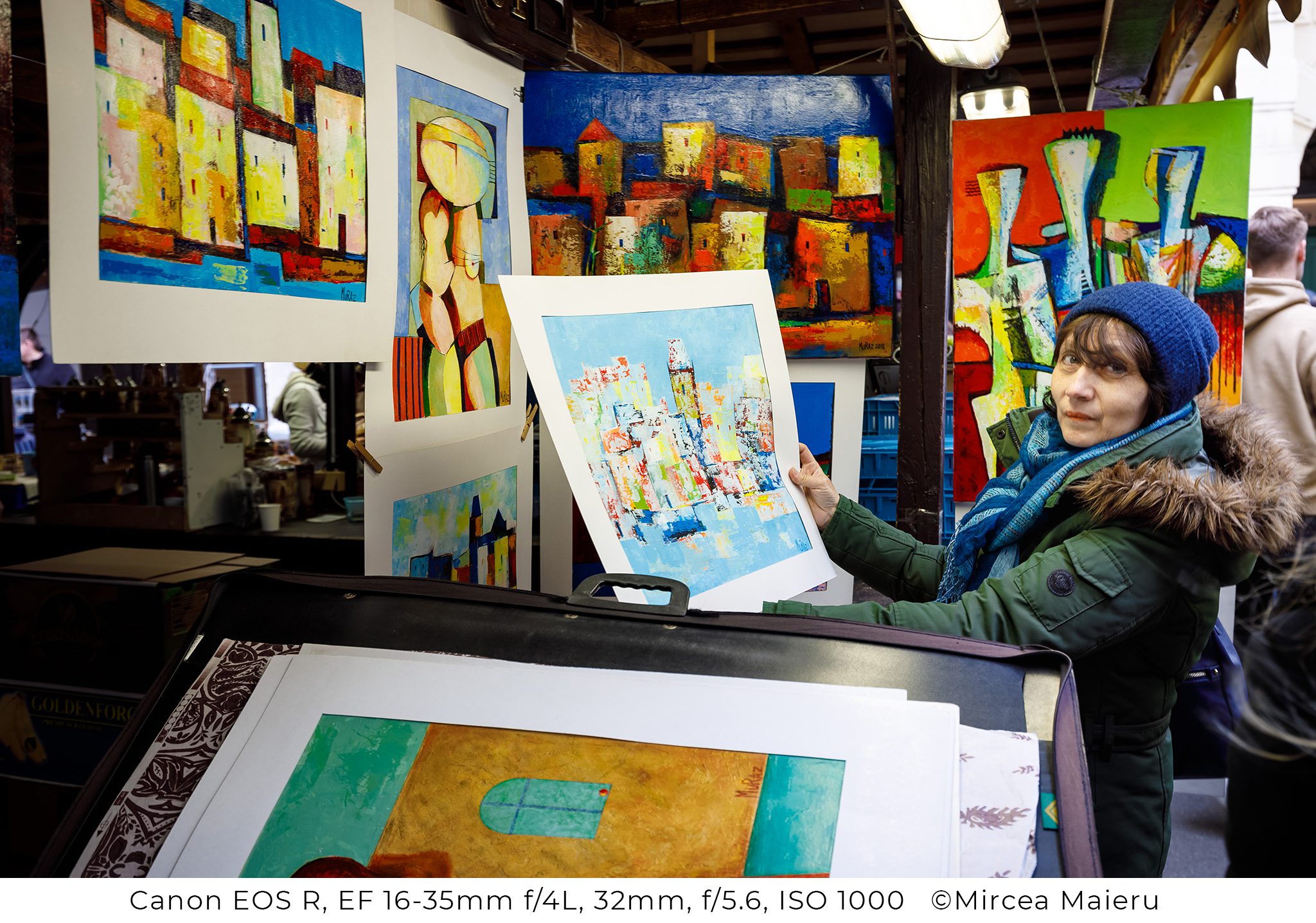 O altă abordare tehnică a fotografiei de stradă, cu aceeași focală ultra wide (grandangulară), este portretul de foarte aproape, cu punct de stație foarte jos, practic tot de la șold, iar avantajul major al lui EOS R aici este dat de posibilitatea de declanșare fără absolut nici un sunet, cu obturator electronic, putând astfel să “vânăm” cadrul și eventual să repetăm cadrul fără ca subiectul să iasă din starea de spirit inițială: