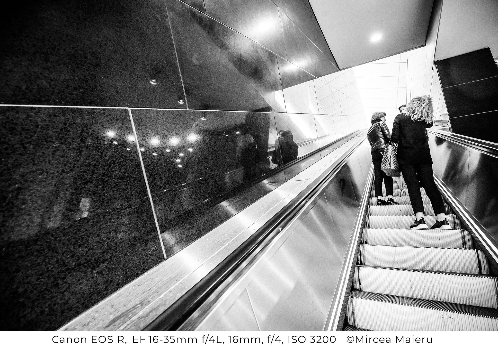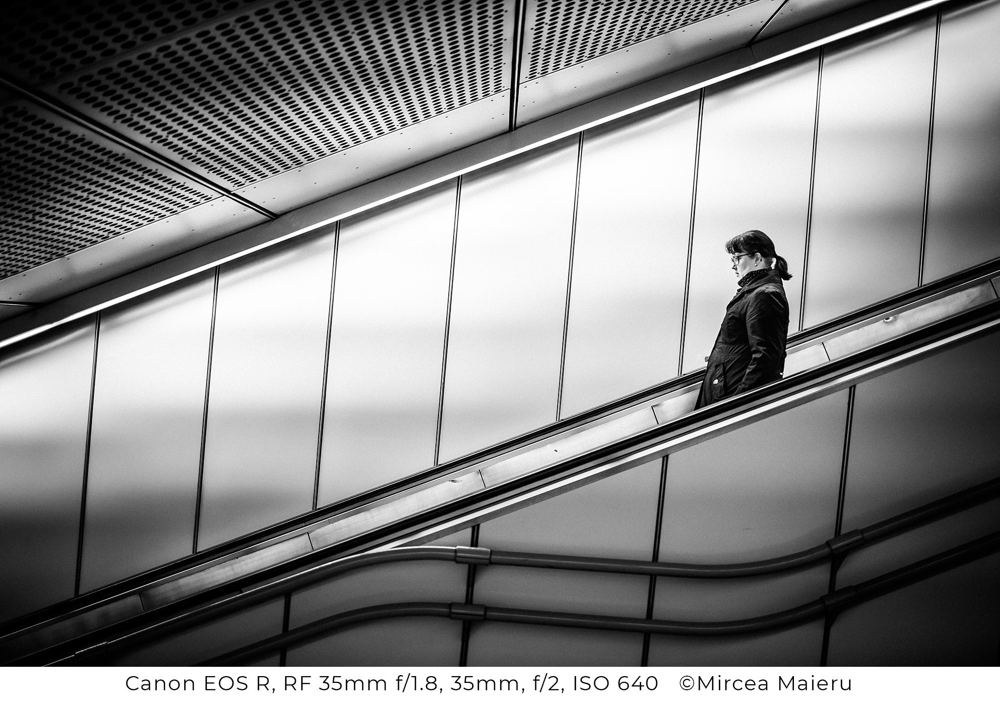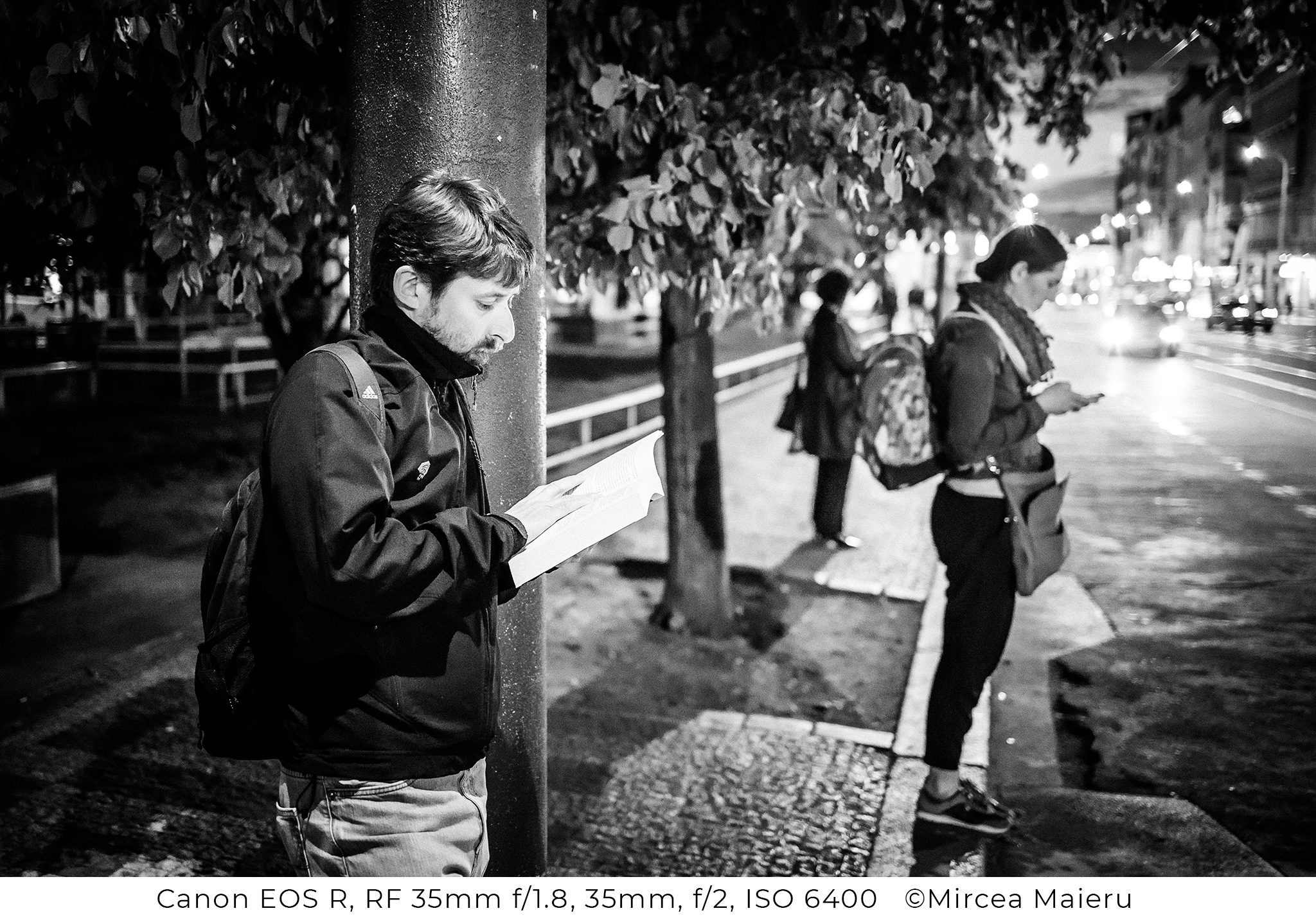 Lucrul în lumină slabă impune un senzor full frame atunci când dorim o redare a culorilor foarte bună la sensibilitate ISO mare sau un zgomot redus în imaginile alb-negru sau color. Aici ne bazăm ori pe calitatea senzorului, ori folosim un obiectiv foarte luminos, sau de ce nu, combinăm ambele atuuri. Având la dispoziție obiectivul RF 35mm f/1.8 cu stabilizare, am încercat câteva cadre de street în mișcarea tramvaiului, cu rezultate spectaculoase: